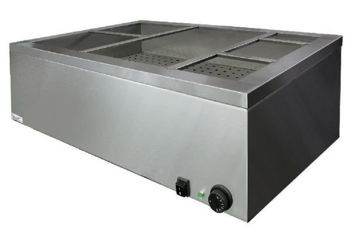 В мармит можно вмещать гастроемкости: 1 шт GN 1/1 + 2 шт GN 1/2 + 3 шт GN 1/3. В мармите предусмотрены специальные перегородки-направляющие для надежной установки гастроемкостей. Гастроемкости могут иметь глубину 150, 100, 65, 40 или 20 мм. Сами емкости в комплект поставки не входят, Вы можете подобрать гастроемкости необходимого Вам размера к этому мармиту, перейдя по ссылке: Гастроемкости.