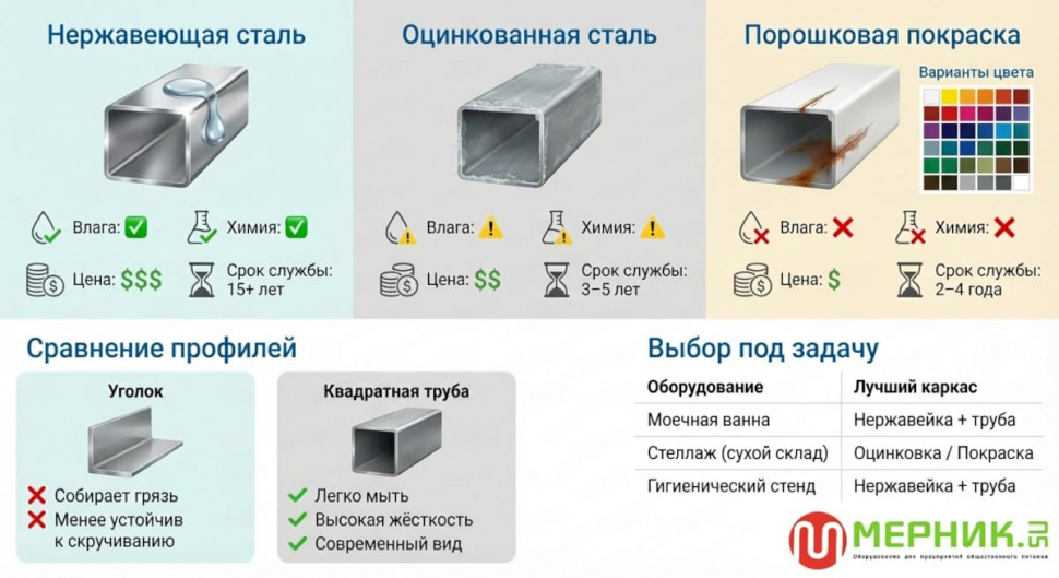 | Моечная ванна (одно-/двух-/трёхсекционная) | Нержавеющая сталь, квадратная труба 40×40 мм | Постоянный контакт с водой, паром, химическими средствами. Требуется максимальная коррозионная стойкость. |